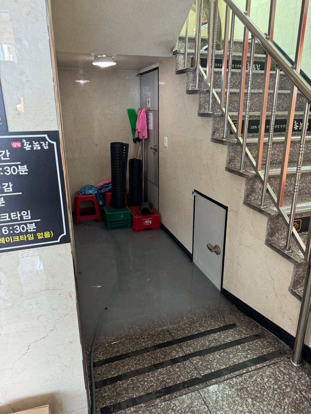 건물 밖 계단까지 물이 역류하여 잠겨있는 상태로 빠른 해결이 필요한 상태였습니다.